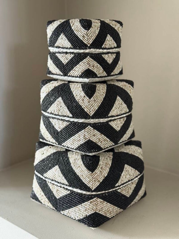Deze prachtige manden uit Bali zijn handgemaakt van bamboe en bewerkt met honderden kleine kralen. Het zijn stevige doosjes waar je allerlei spullen in kunt opbergen. Dit soort offermanden worden in Bali gebruikt voor ceremonies.