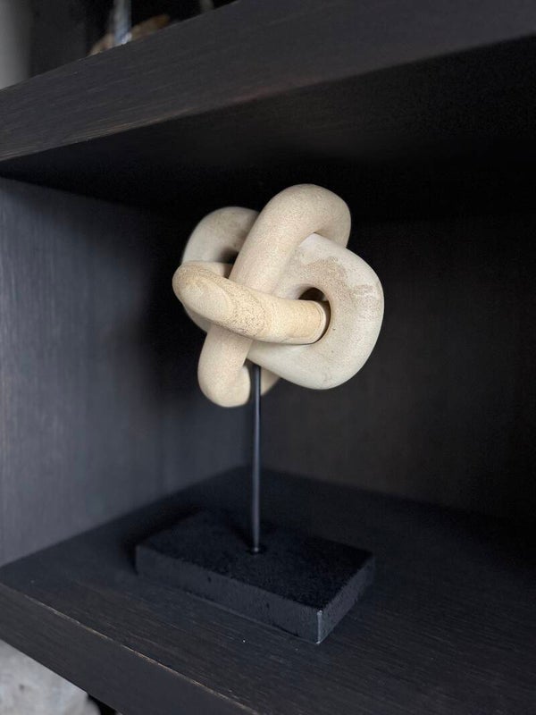De twee in elkaar verweven vormen van glad, zandkleurig natuursteen stralen rust, balans en elegantie uit. Perfect als eyecatcher op een dressoir, wandplank of salontafel.