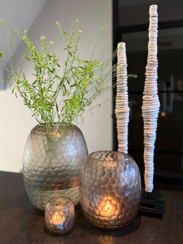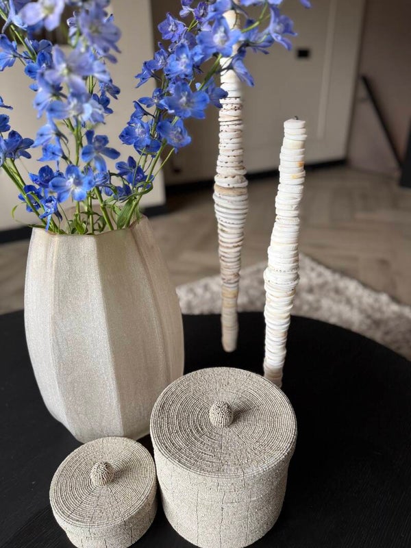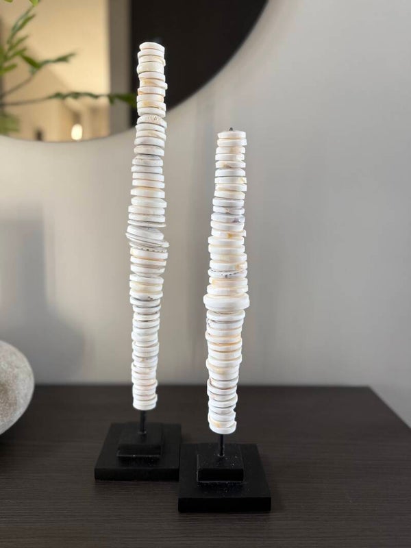 Gemaakt van echte schelpen, elk stuk uniek in kleur en structuur. De torens staan stevig op een zwarte voet en vormen samen een elegant, natuurlijk geheel.