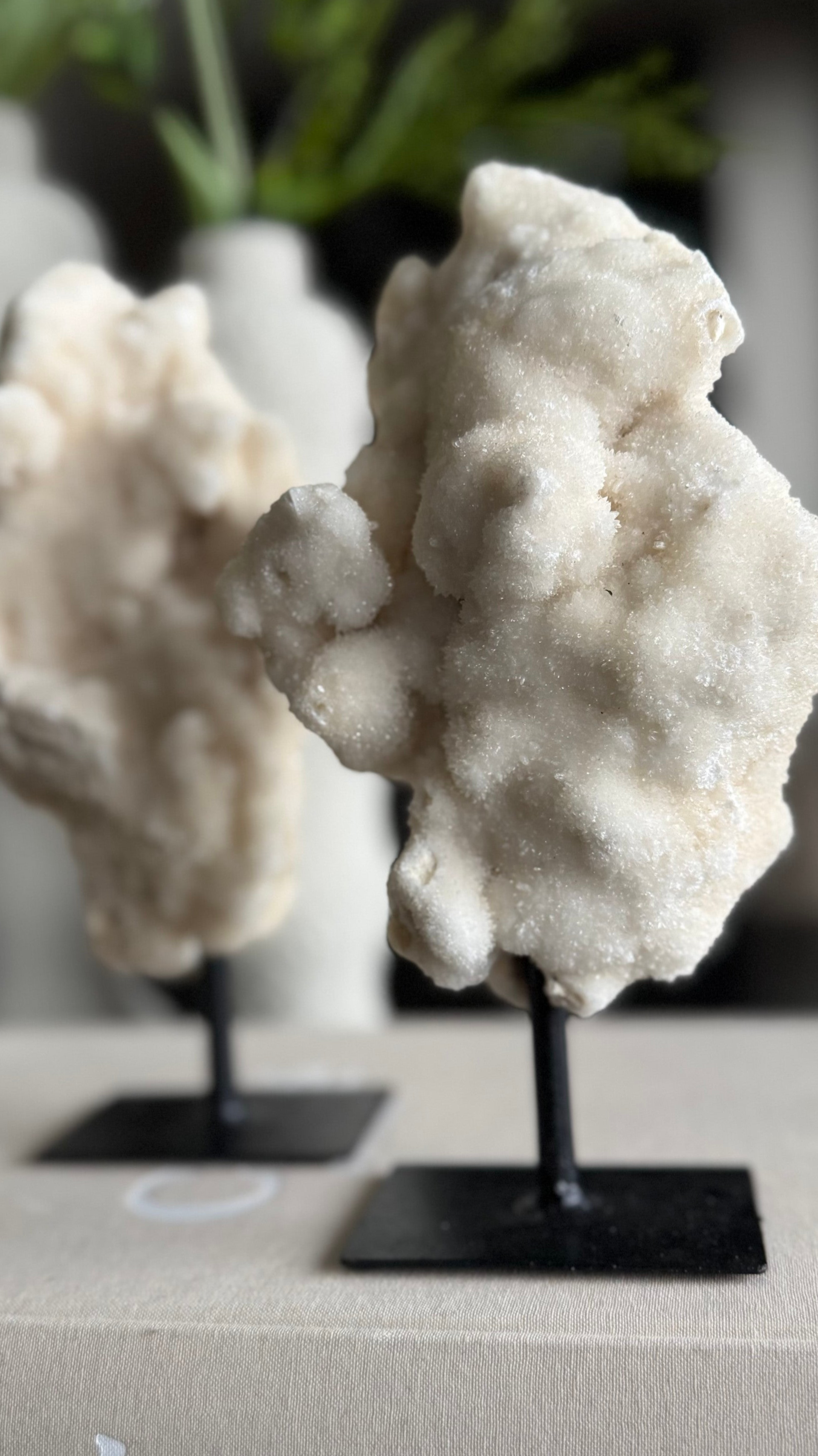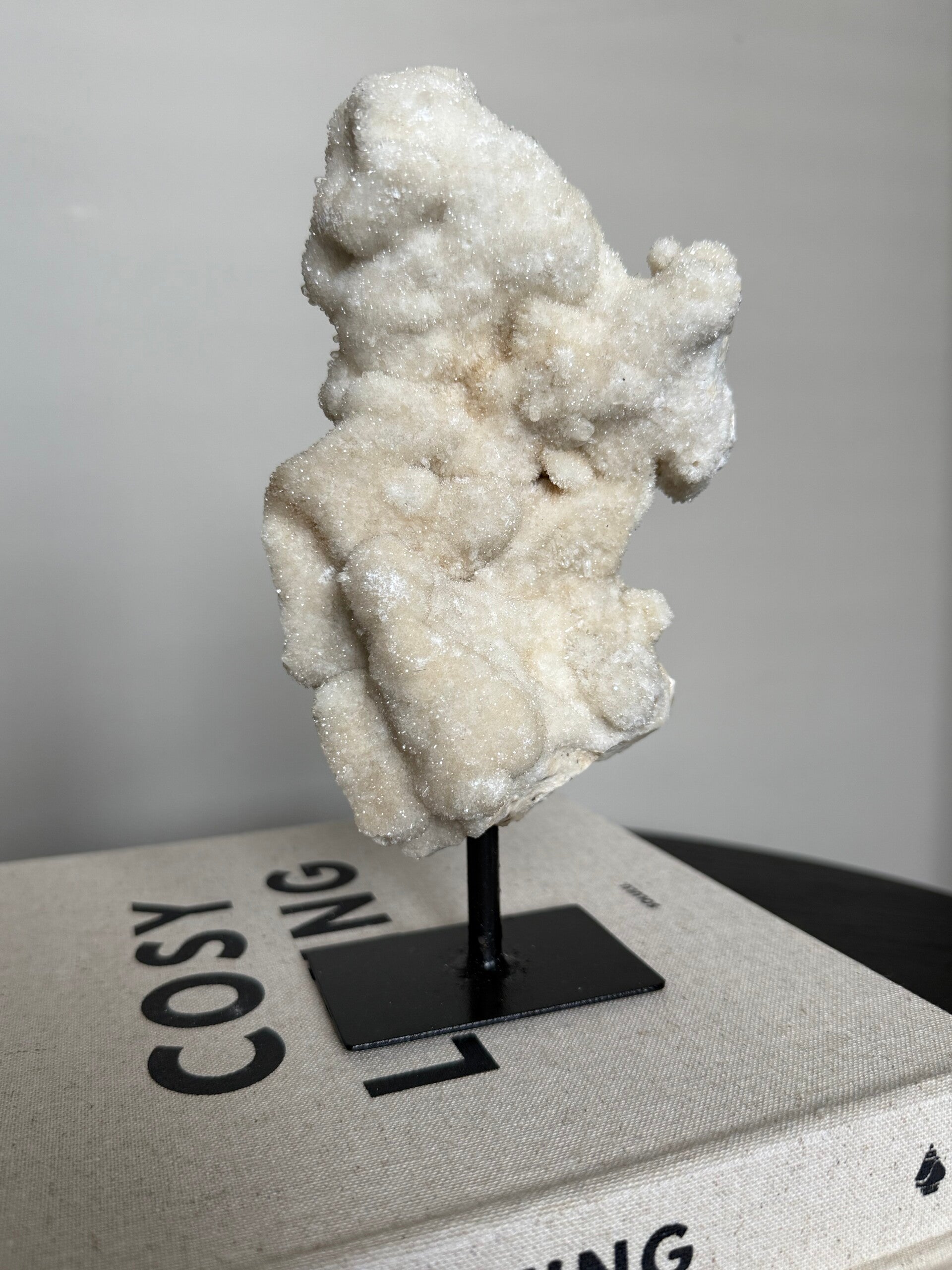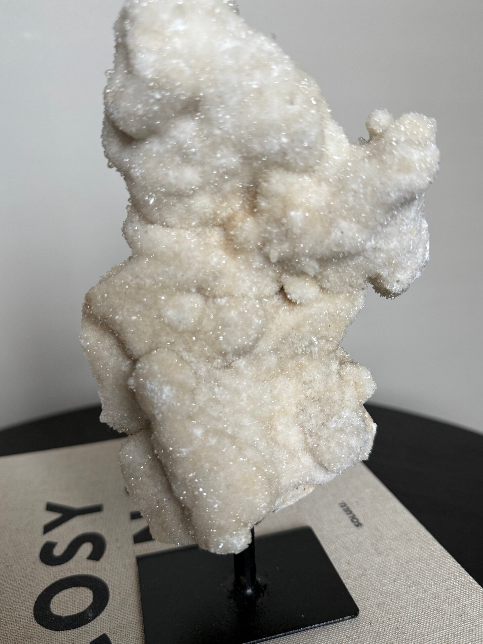 Prachtig stuk calciet op statief, glinstert waanzinnig in het licht.