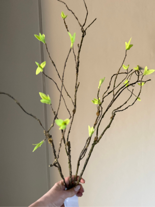 Mijn favoriete tak om mee te stylen, deze krul tak met groene blaadjes. In de takjes zit ijzerdraad wat het makkelijk maakt om de takken te buigen.